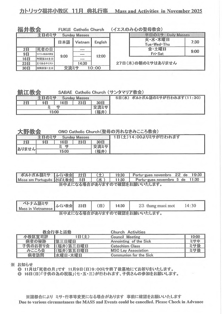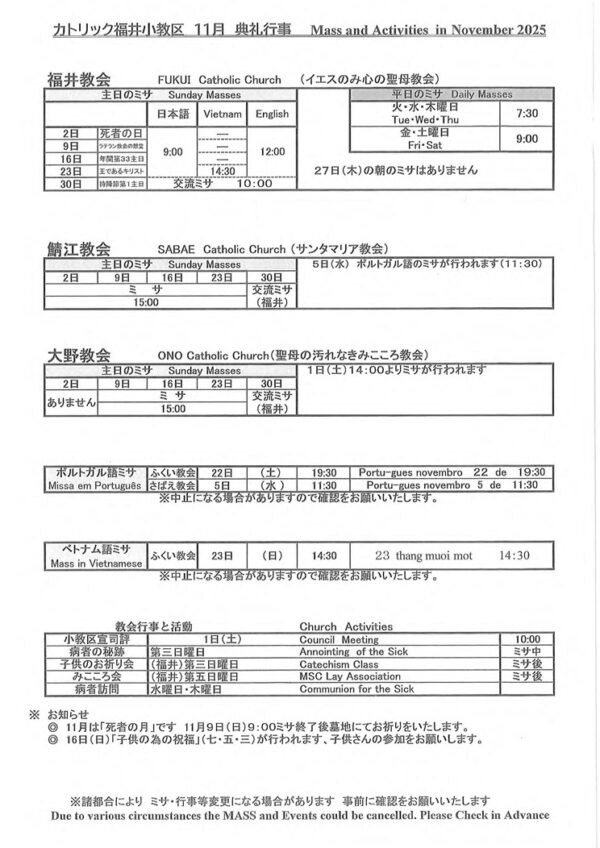 【変更あり。注意!】2025年11月 行事予定表(Mass and Activities in November 2025)2025年10月26日