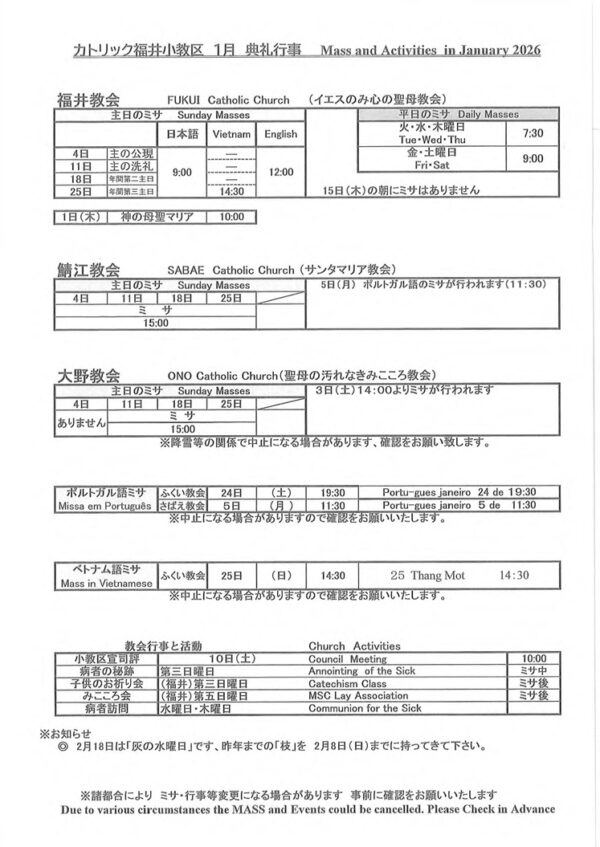 2026年1月 行事予定表(Mass and Activities in January 2026)2025年12月28日