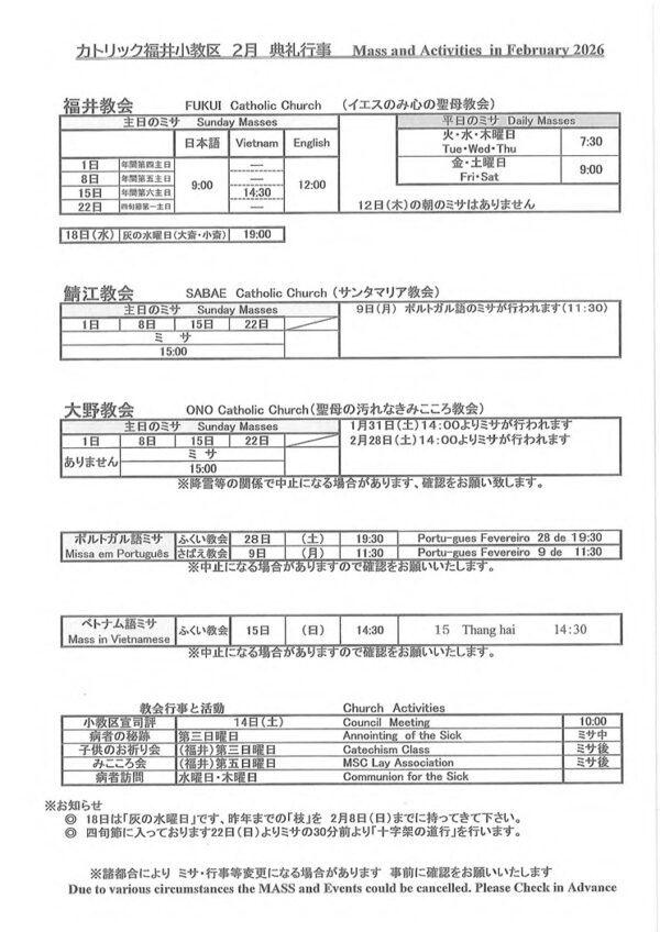 2026年2月 行事予定表(Mass and Activities in February 2026)2026年01月30日