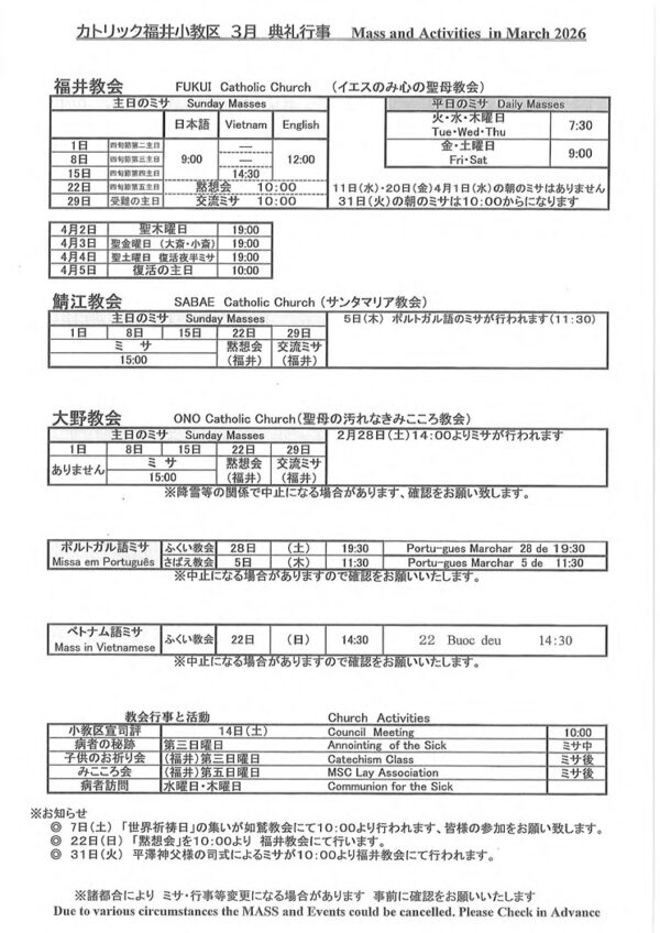 皆様こんにちは。雪も溶け、いつの間にか春のようになりましたね。この間までの大雪が嘘のようです。 3月は、黙想会、交流ミサがあり、ミサの時間の変更がありますので、ご注意いただければと思います。 また、4月頭には復活祭もありますので、ご確認ください。