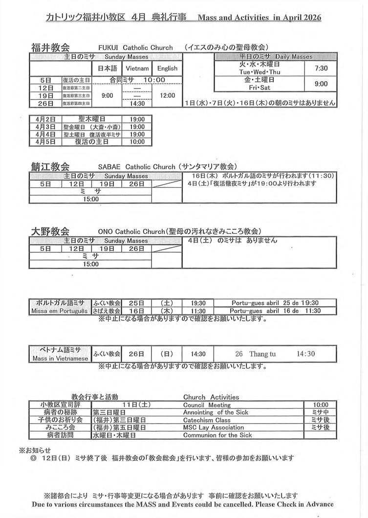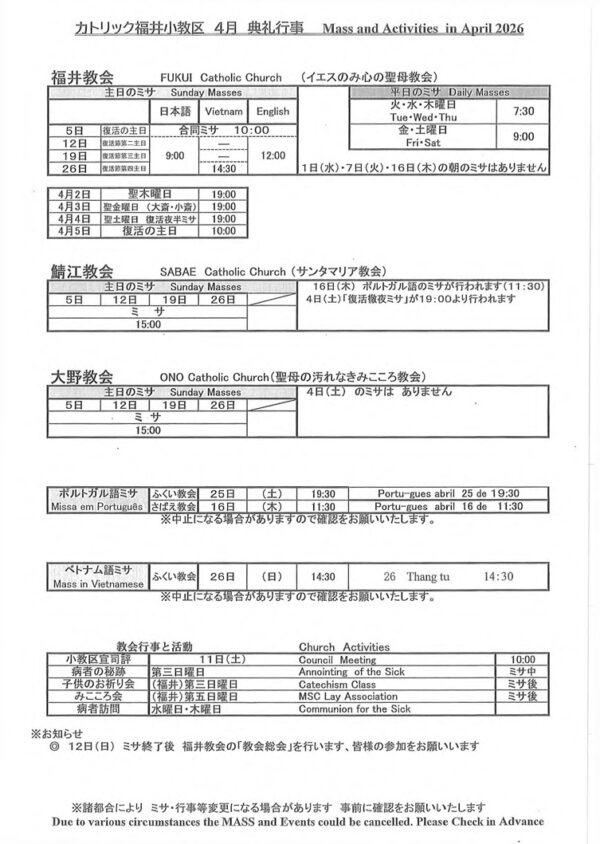 2026年4月 行事予定表(Mass and Activities in April 2026)
